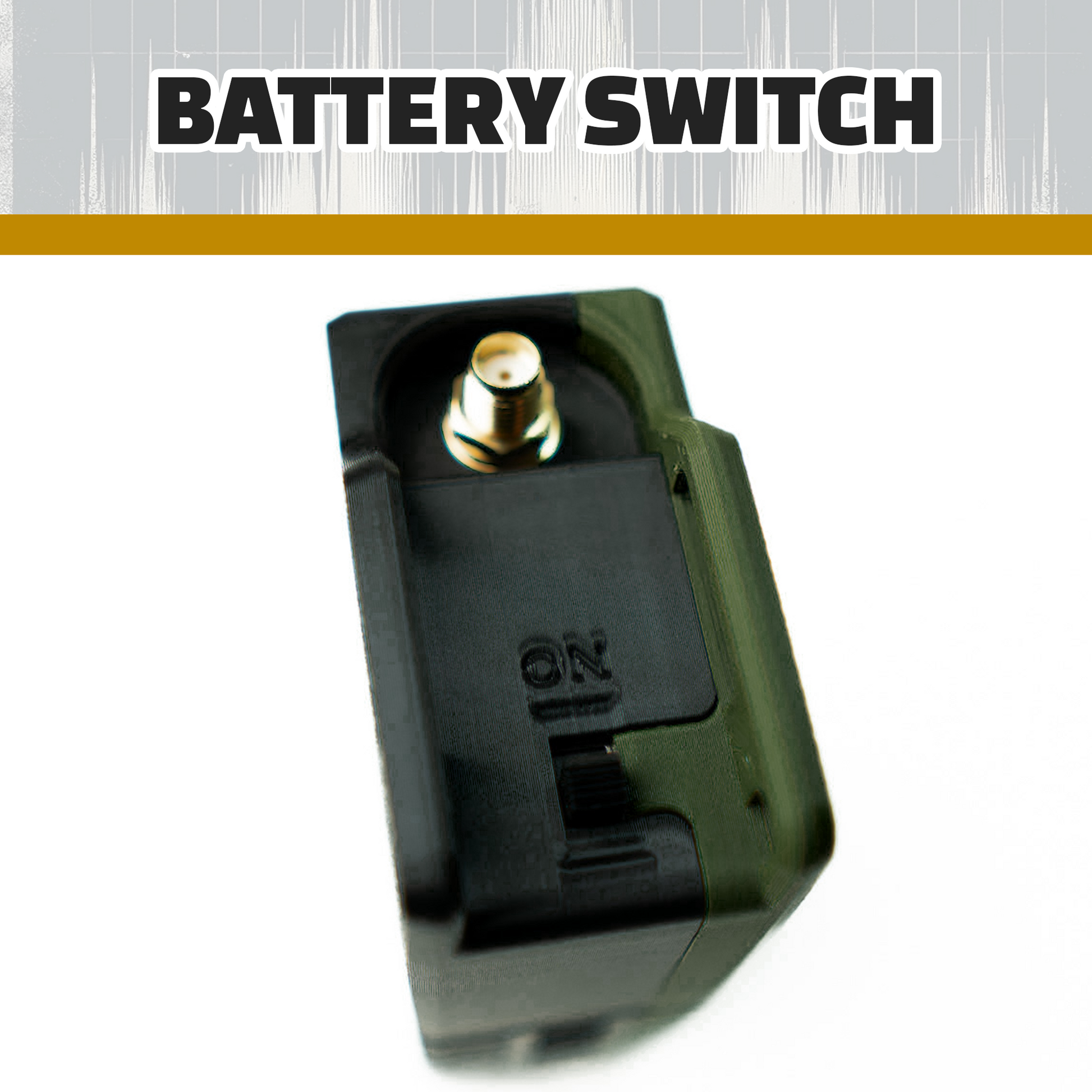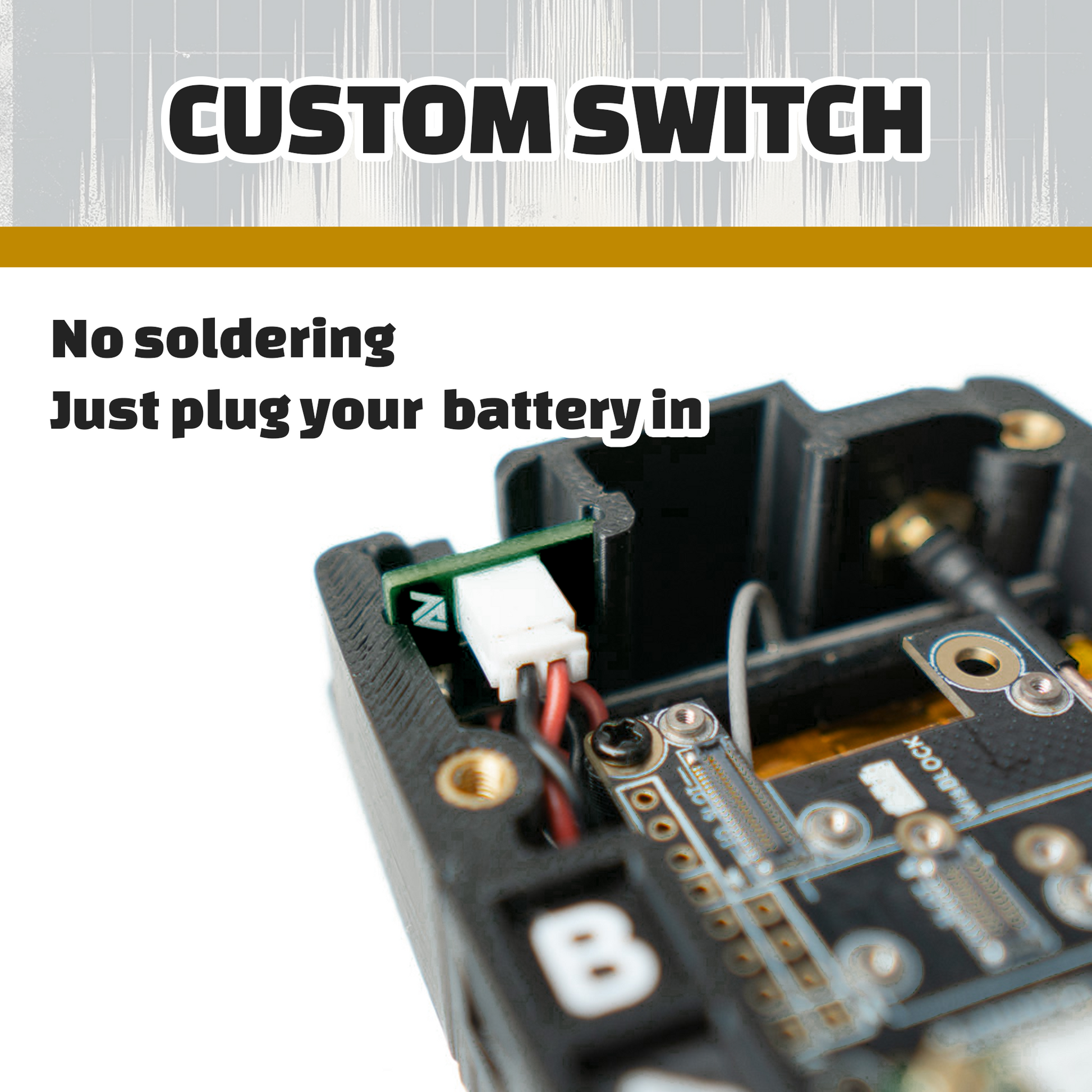 - Plug-and-Play Battery Switch No soldering required. The battery plugs into the preinstalled, custom-switch PCB header and uses an auxiliary cable to power the WisBlock. The battery switch, conveniently located at the top of the radio, is accessible one-handed by the thumb holding the radio. The switch is protected by top rails to prevent accidental interaction, and the strap and cordage slots bypass the switch. The switch needs to be on in order to charge the battery, but you can power down the radio module in the Meshtastic app while charging if you'd like to.