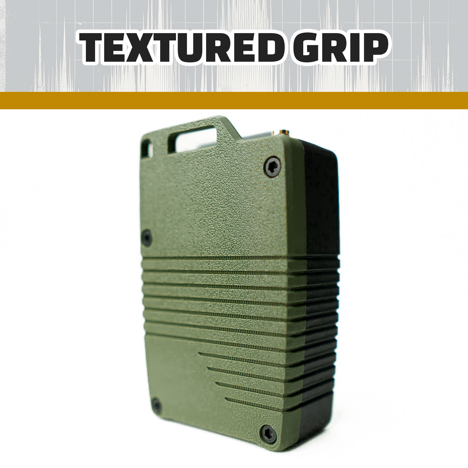 - PETG/HT-PLA 3D printed, two-part case. We are transitioning the black base to a beautiful matte, high-temp PLA, rated for 150°C, printed with 4 walls and 1.6 layer height, resulting in a durable, heat-resistant, rugged finish. Textured front and back, with grooves recessed around the body, further enhances grip. The top cover is PETG "Forest Green". (More top colors coming soon.)