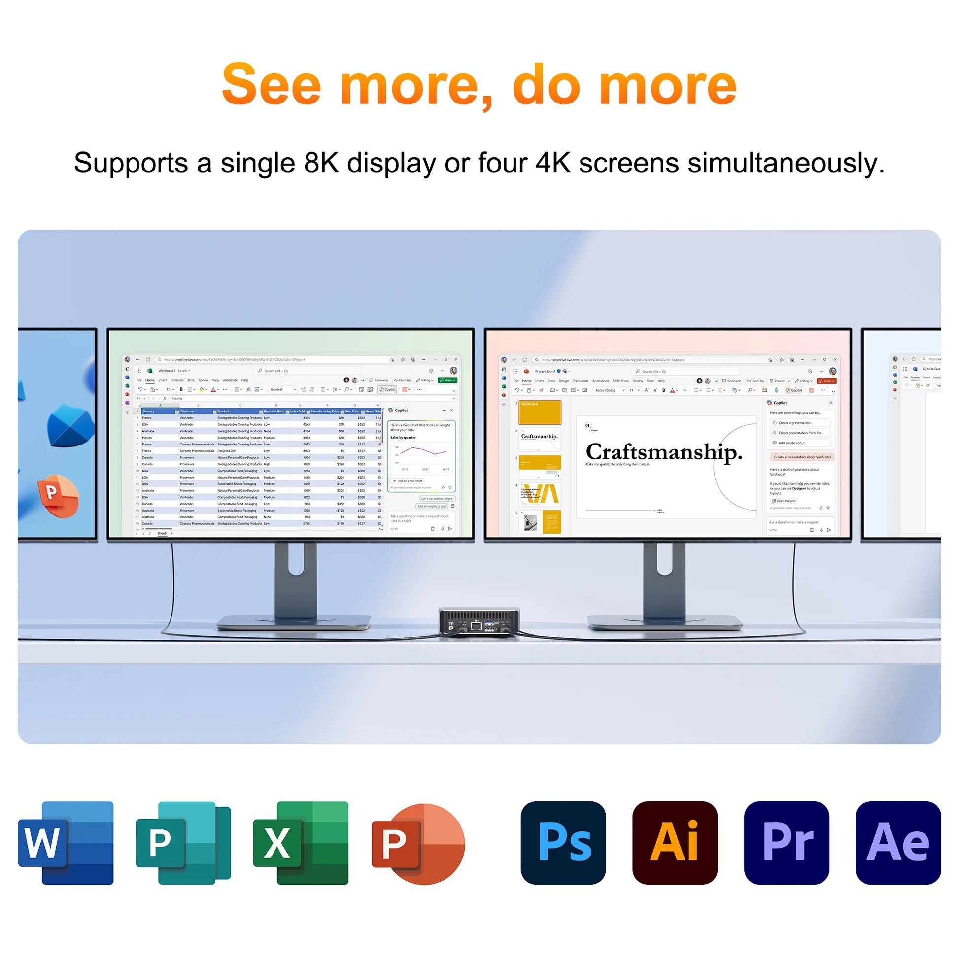 - Rich Connectivity & Multi-Display Support: SStay connected with 6 USB ports (including 1x USB4 and 1x USB 3.2 Gen 2 Type-C for 40Gbps data/charging with Power Delivery, plus 3x USB 3.2 Gen 2 Type-A and 1x USB 2.0), an SD card reader, WiFi 6E, Bluetooth 5.2, and 2.5G Ethernet. Expand to up to 4 displays via the USB4/Type-C ports and 2x HDMI 2.0, supporting stunning 8K resolution—ideal for creators juggling multiple screens or immersive setups.