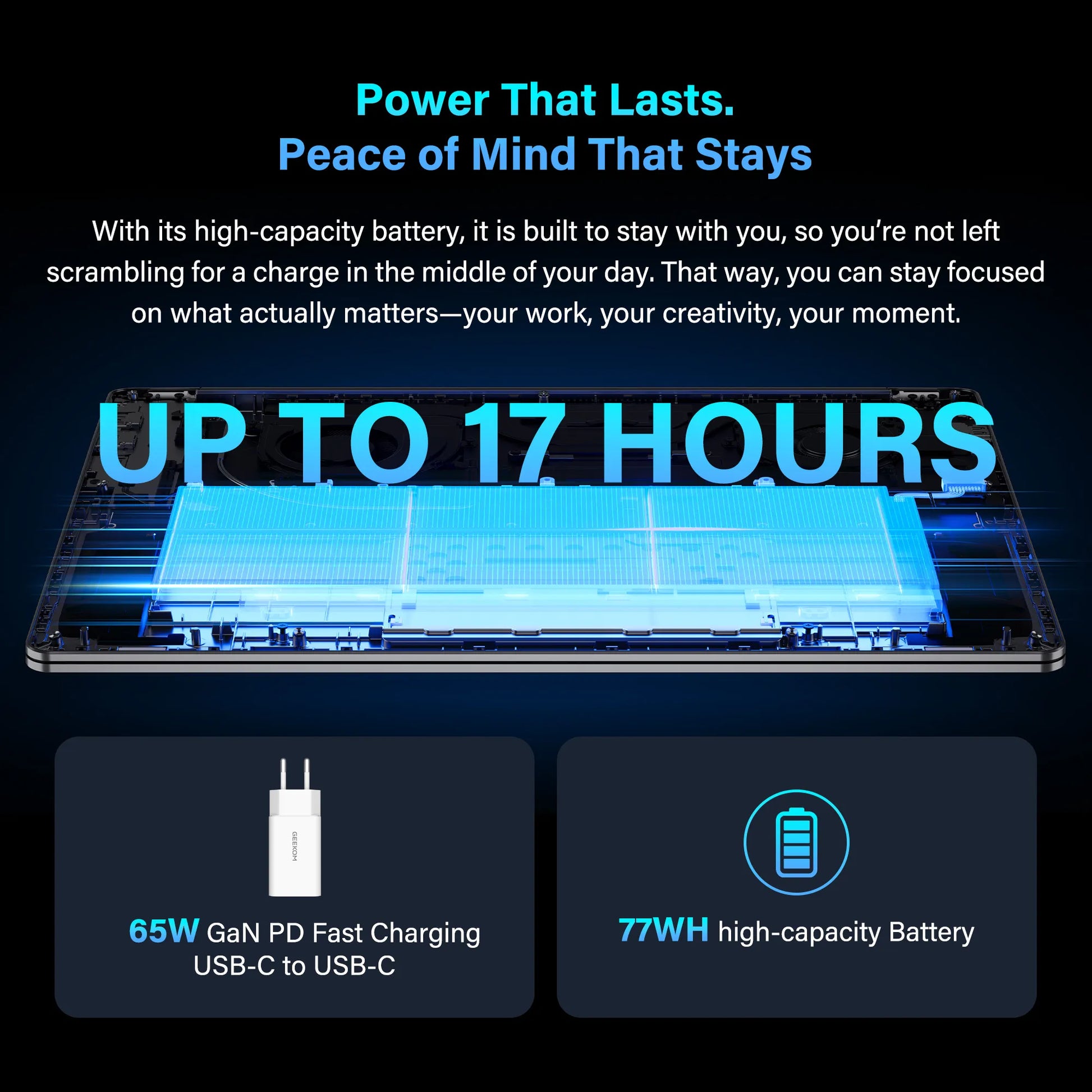 - Powerful Battery – Up to 17 hours of runtime, fast charging with compact 65 W GaN adapter