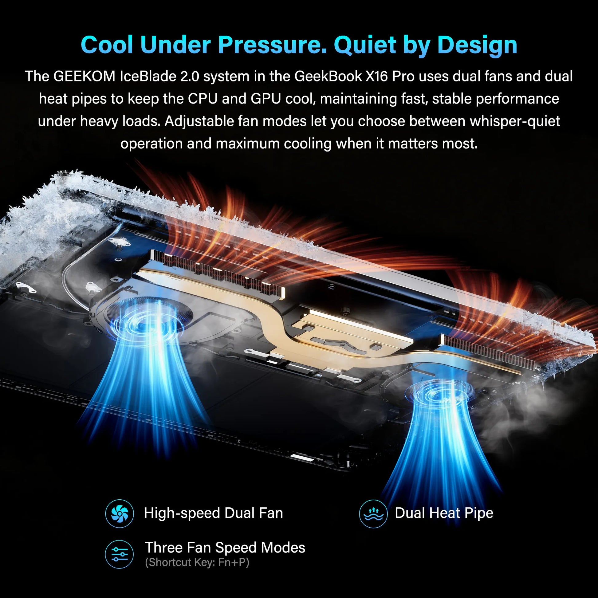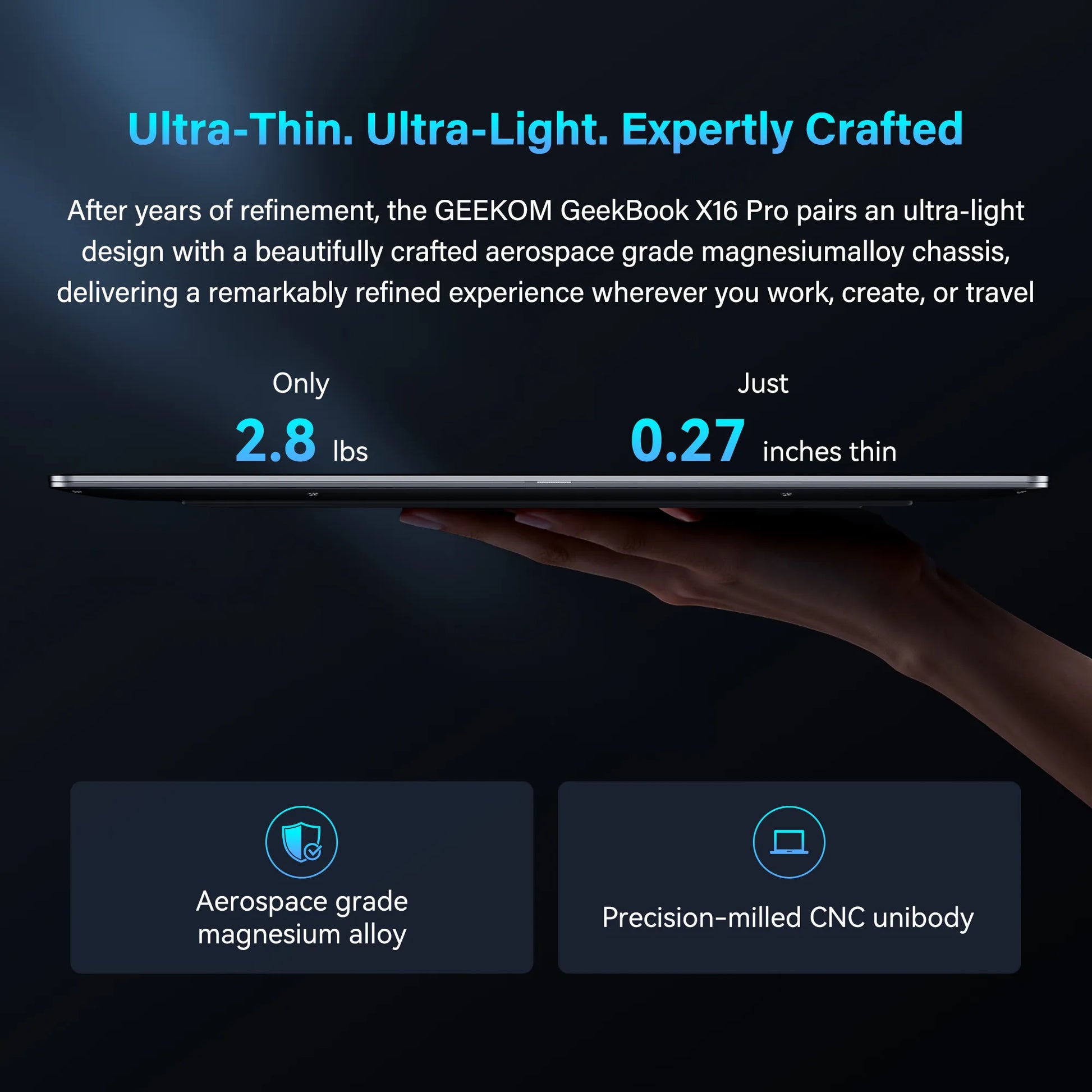 Power of Lightness. The GeekBook X16 Pro redefines portable performance. At just 0.27 inches thin and 2.8 pounds, this precision-crafted magnesium alloy unibody laptop delivers flagship Intel Core Ultra power, a stunning 16" 2.5K 120Hz display, and up to 17 hours of battery life—all in GEEKOM's lightest and most capable design yet. Built for creators, professionals, and everyday excellence.