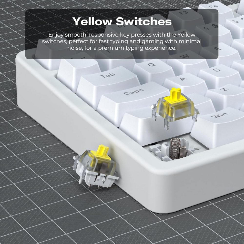 - Premium Yellow Switches: Enjoy responsive, low-noise keystrokes with hot-swappable Yellow switches, optimized for fast typing, gaming, or extended sessions—offering durability and comfort without the clack of traditional mechanicals.