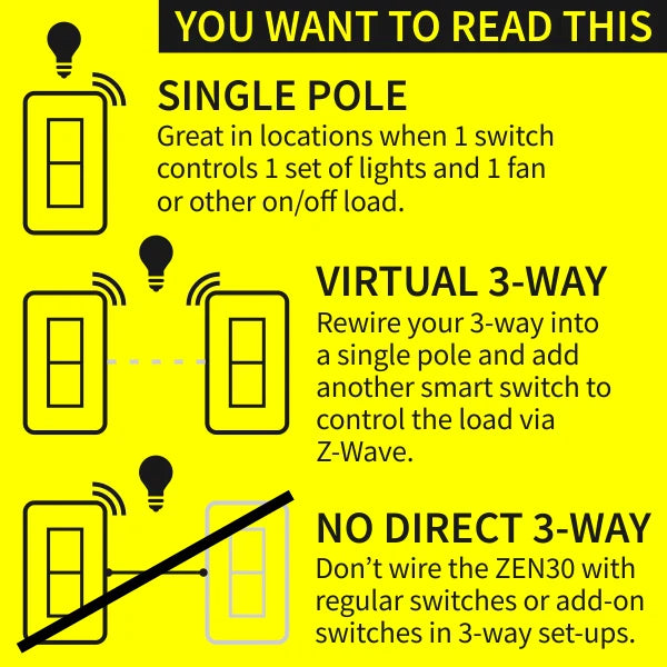 - NO DIRECT 3-WAY: use in single pole set-ups only. Can be used in virtual 3-way's without any direct connections to the other switches in 3-way and 4-way installations. Contact us for details.
